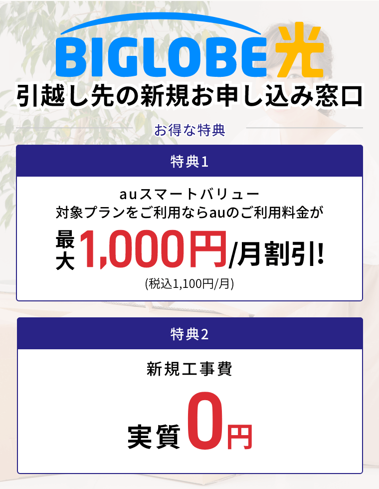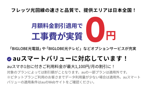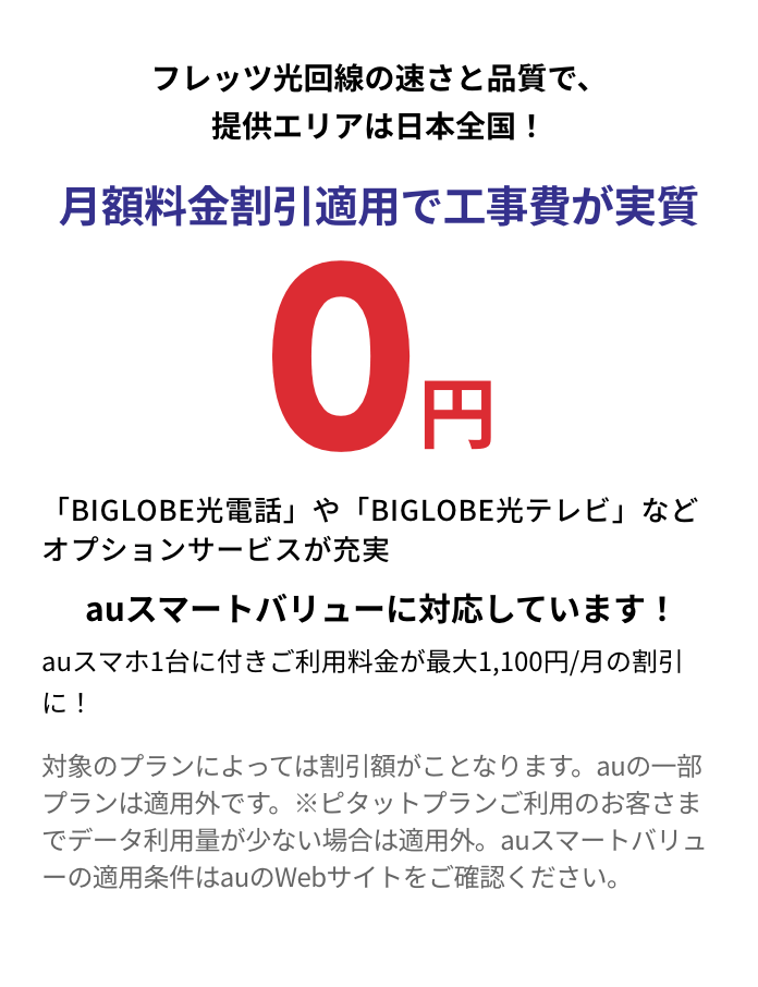 特典1※BIGLOBE光とBIGLOBE光電話をセットでご利用することにより、「auスマートバリュー」がご利用できます。「auスマートバリュー」は毎月、auスマートフォン1台に付きauのご利用料金が最大1,100円/月(税込)の割引となるお得なサービスです。